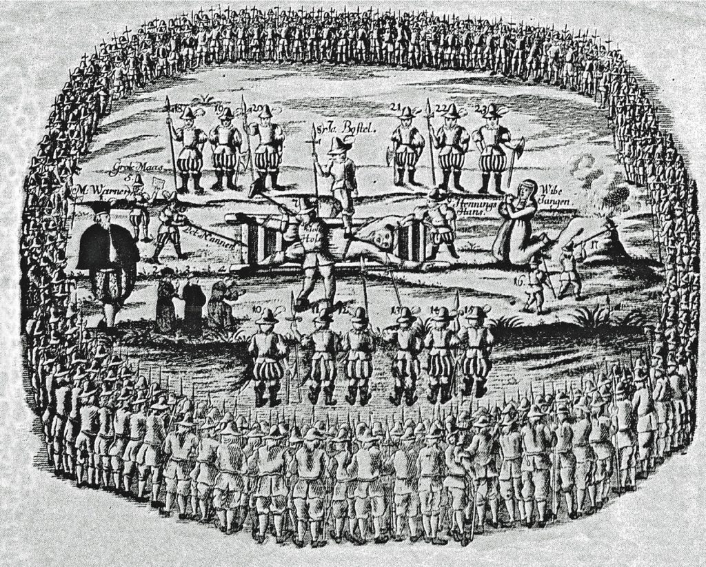 Meanwhile the monks were exerting themselves with the utmost diligence, complaining and inciting commotion, and they achieved what they wanted. For on Friday night, after midnight, before the Third Sunday of Advent, forty or fifty armed men arrived in Meldorf, using the monks’ lamps for their light, and, full of Hamburg beer, they forcibly entered the pastor’s house in a hostile manner and cruelly dragged Christ’s martyr out of bed. After tying him to the tail of a horse, they dragged him with great exaltation to Heide, which is a good mile distant from Meldorf.1 When they arrived there, they threw him into the cellar of a certain priest. Everyone was drinking, singing, and making sport.