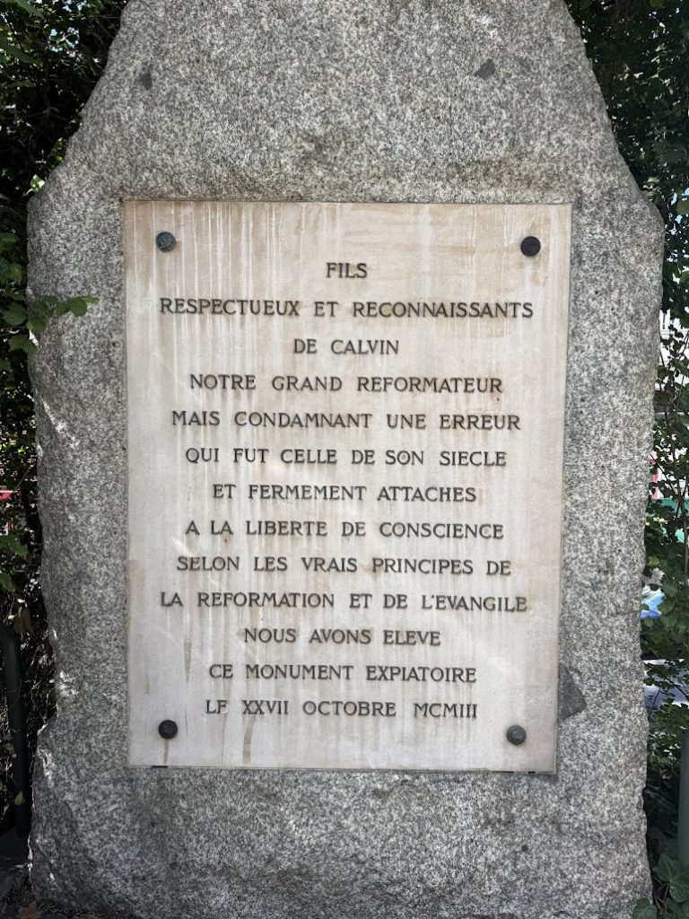Duteous and grateful followers of Calvin our great Reformer, yet condemning an error which was that of his age, and strongly attached to liberty of conscience according to the true principles of his Reformation and gospel, we have erected this expiatory monument. Oct. 27, 1903