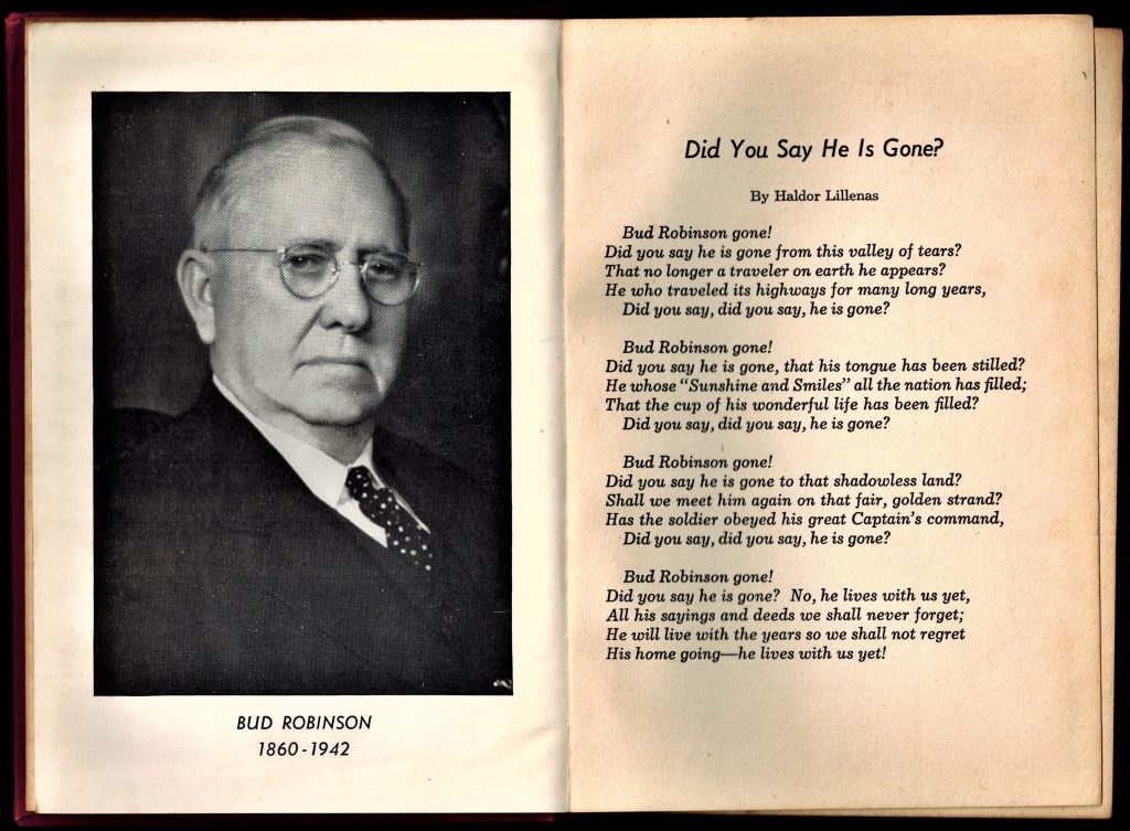 Over his long career, Robinson is said to have preached more than 30,000 sermons and led tens of thousands to faith in Christ. He wrote numerous books and pamphlets, though his writing style remained as simple and direct as his preaching. His best-known book, Uncle Bud Robinson: The Country Preacher, along with The Sunshine Side of Life and Laughing Along Life’s Way, shared his spiritual insights and humor with readers across the nation.