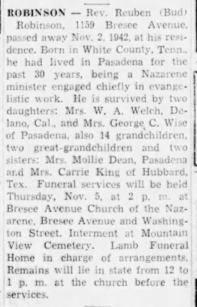 Reuben “Uncle Bud” Robinson passed away on November 2, 1942, at the age of eighty-two. At the time of his death, he was revered across denominational lines as one of the most effective evangelists of his generation. His funeral drew large crowds, and tributes poured in from preachers and laypeople alike who had been touched by his ministry.