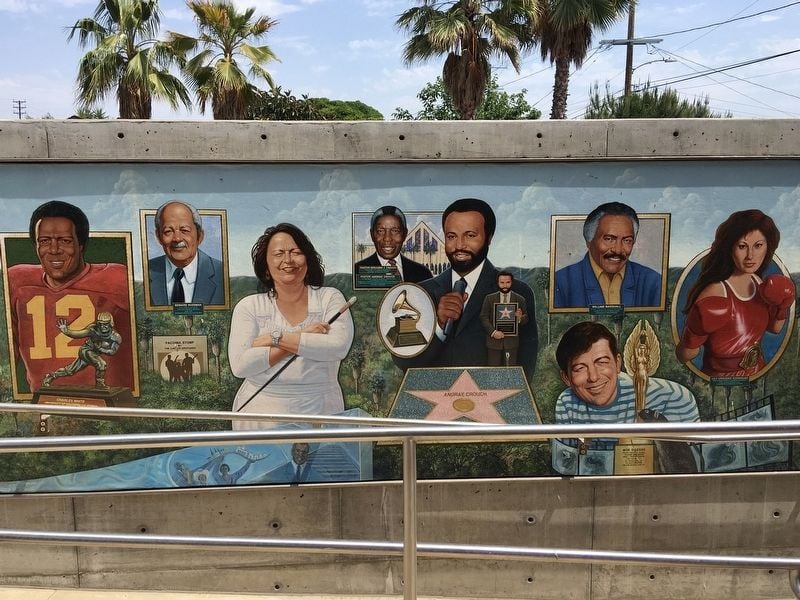 Pastor Andrae Crouch, gospel singer, recording artist, song writer, arranger and producer, worked with Michael Jackson, Diana Ross, and Elton John. 2004 received a star on the Hollywood Walk of Fame. Received 8 Grammys. (Pacoima Neighborhood Mural Historical Marker. 17 Mar. 2025, www.hmdb.org/m.asp?m=175733)