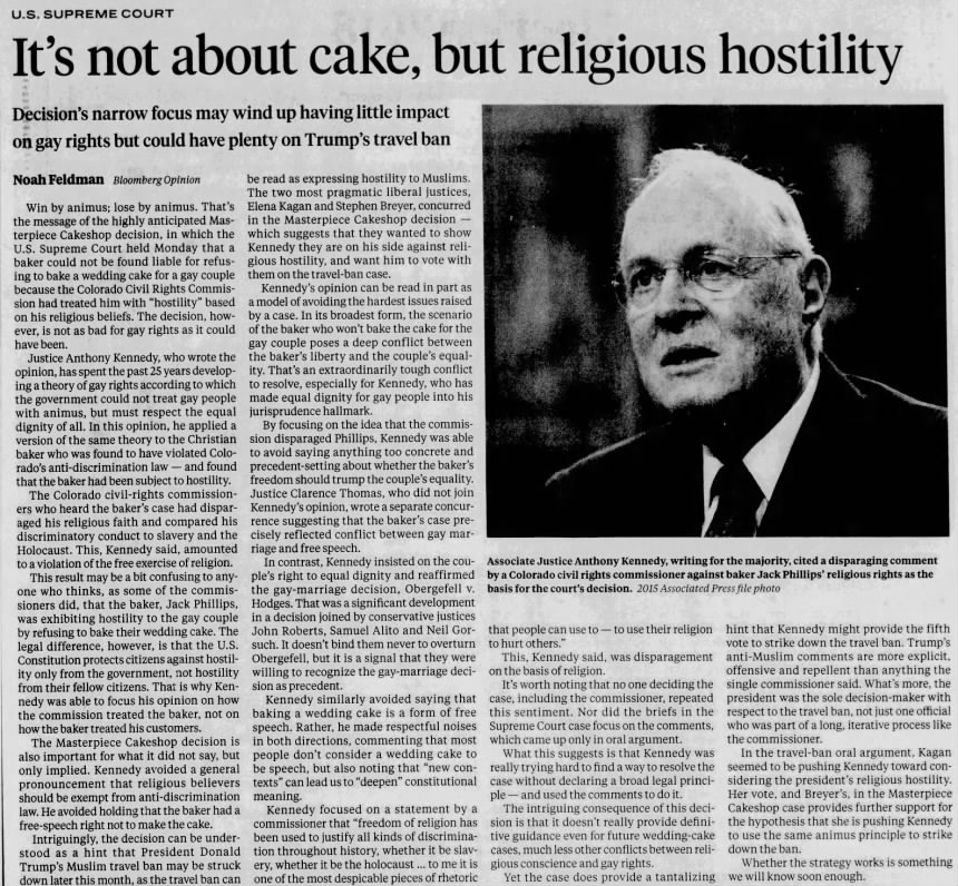 The case dealt with Masterpiece Cakeshop, a bakery in Lakewood, Colorado, which refused to design a custom wedding cake for a gay couple based on the owner’s religious beliefs. The Colorado Civil Rights Commission evaluated the case under the state’s anti-discrimination law, the Colorado Anti-Discrimination Act. The commission found that the bakery had discriminated against the couple and issued specific orders for the bakery. Following appeals within the state, the Commission’s decision against the bakery was affirmed, so the bakery took the case to the U.S. Supreme Court.