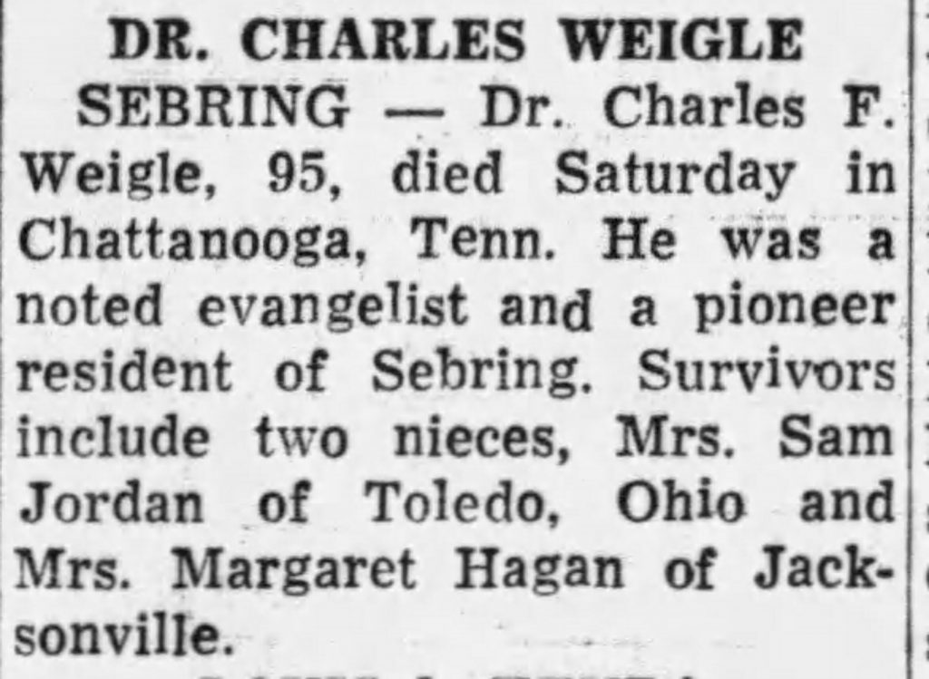 The Charles F. Weigle House Museum in Sebring, Florida stands as a testament to his personal history and local influence. Built in 1922, the house is preserved by the Sebring Historical Society and honors his presence in the community.