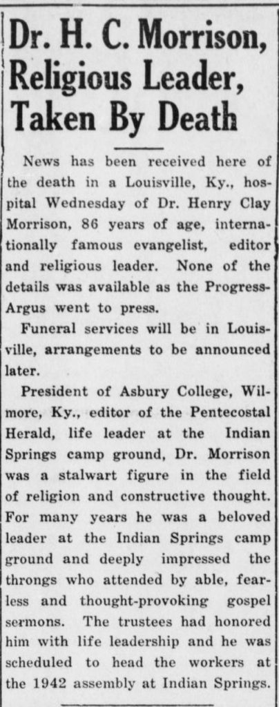 Henry Clay Morrison passed into the presence of the Lord on March 24, 1942. At the time of his death, he was recognized as one of the primary architects of the modern holiness movement. His influence continues through: