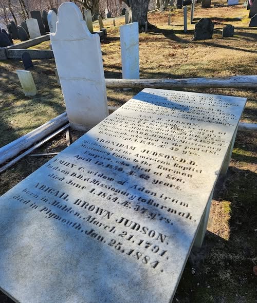 Inside a white fence is not a grave, but a cenotaph, “a monument to someone buried elsewhere.” Adoniram Judson was the son of a Congregational minister in Plymouth, but he fell in with the wrong friends. While at Brown University, he was befriended by Jacob Eames, who led Judson away from his faith. Judson later stopped at an inn to spend the night, only to be awakened by the dying screams of a terrified man. As he departed the next morning, he found out those were the screams of the infidel Jacob Eames.