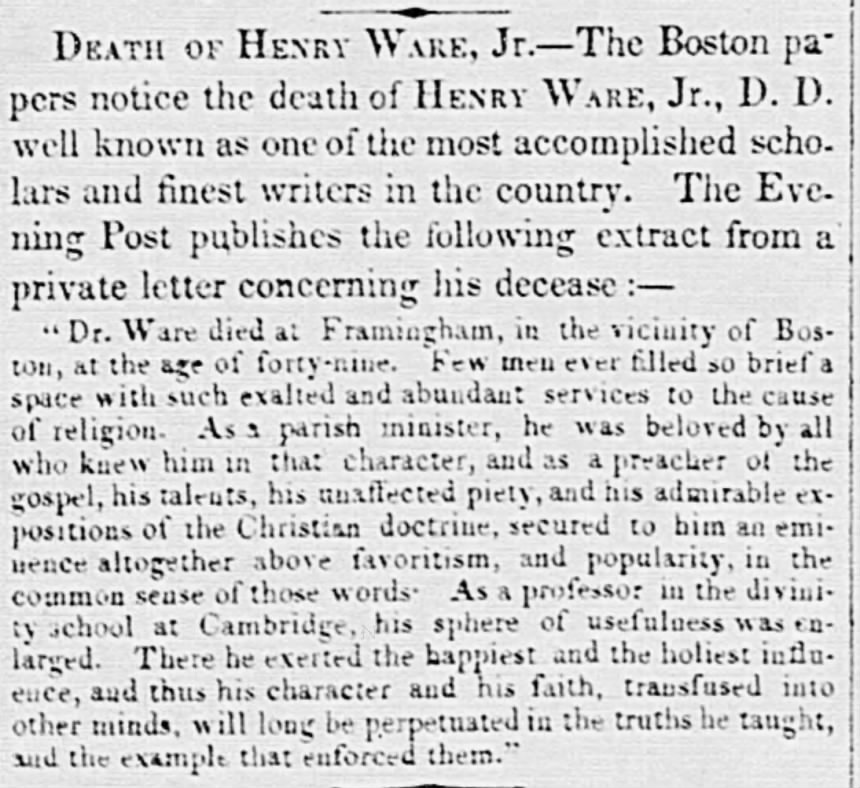 Following in his father’s footsteps, Henry Ware Jr. studied at Harvard College, graduating in 1812, and later entered the ministry. He served as pastor of the Second Church in Boston, one of the most influential pulpits of the day, and later became a professor of pulpit eloquence and pastoral care at Harvard Divinity School.