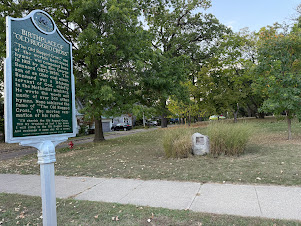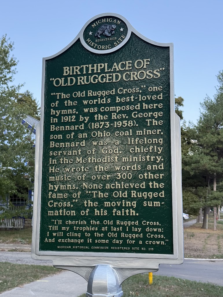 The Old Rugged Cross is one of the most beloved – and most claimed hymns! Our Christian Heritage has been to the Old Rugged Cross church on Pokagon, MI where it was first performed in its entirety and we’ve interviewed the couple that restored the church. We’ve also been to Sturgeon Bay, WI where the Friends Church is that it was first partially performed. But on this stop we’re at the site where it was written – in an apartment of a professor of Albion College that became a fraternity house before it was demolished in the 60s. This marker was recently restored after the previous was destroyed in a car crash in 2020.