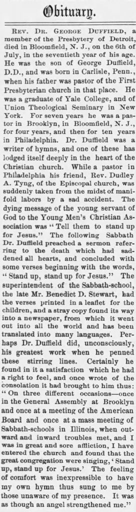 The inspiration for “Stand Up, Stand Up for Jesus” came from a personal tragedy: the death of his friend and fellow minister, Rev. Dudley Atkins Tyng. Tyng, a young pastor from Philadelphia, had become a passionate advocate for abolition and social reform. He died in 1858 after an accident while riding a horse. Before his death, Tyng had famously exhorted his congregation: “Stand up for Jesus!” Duffield, moved by his friend’s faithfulness and zeal, wrote the hymn in Tyng’s memory as a tribute and as a call to others to emulate his courage.