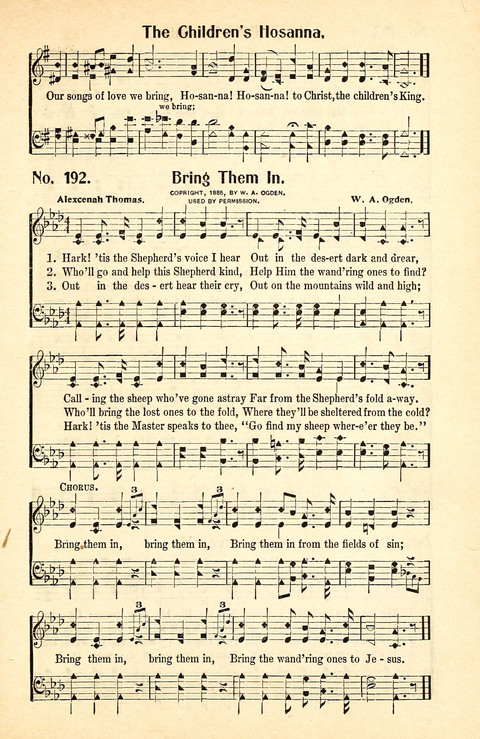 “Sunday School workers began to recognize that music was a natural way to teach the children and provide scriptural and life lessons for them to easily remember. This is a song which was written for Sunday School sometime in the early 1880s … Alexcenah Thomas was aware of this movement, which inspired her to pen the hymn, Bring them In.”