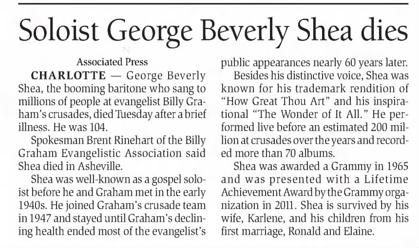 “I’d Rather Have Jesus” became Shea’s signature song. He sang it countless times at crusades, on radio broadcasts, and on records. Its simple, heartfelt message complemented Graham’s straightforward preaching of the Gospel. For many listeners, Shea’s rendition of the hymn became a moment of personal reflection—an invitation to weigh their own priorities and to choose Christ.