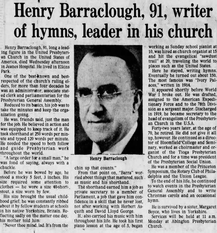 “Twenty-four year old Henry Barraclough’s path to a hymn he was writing was circuitous … He might never have imagined the words to ‘Ivory Palaces,’ except that he had agreed to be the