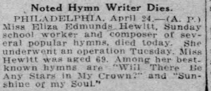 Eliza Hewitt was a songwriter who penned numerous Christian hymns. As a young woman, Hewitt taught at a Philadelphia public school, but after becoming ill with a spinal condition, she was confined to her bed. As her health improved, she began to write lyrics to songs, including “Sunshine in My Soul” and “Stepping in the Light,” and she collaborated with several well-known composers such as John R. Sweney, William J. Kirkpatrick, and B.D. Ackley. Hewitt wrote over 150 hymns throughout her life.