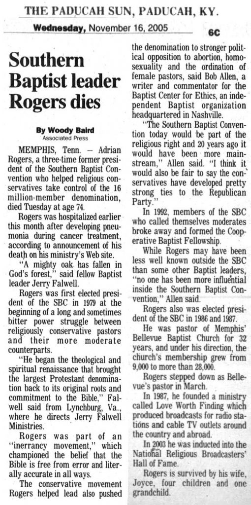 On November 15, 2005, Adrian Rogers died at age 74 from complications of colon cancer and double pneumonia. His death prompted tributes from across the evangelical world. His enduring legacy can be reviewed in several dimensions: