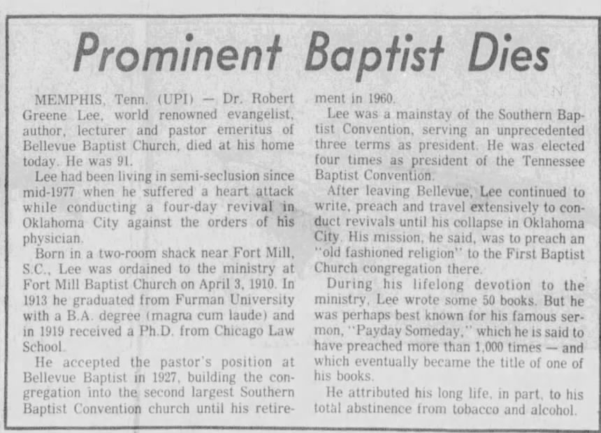 - Denominational Influence – As SBC president and institutional leader, Lee helped shape mid-century Baptist life in America. His influence on Baptist polity, evangelism, and theological emphasis contributed to the shape of the denomination in his era.