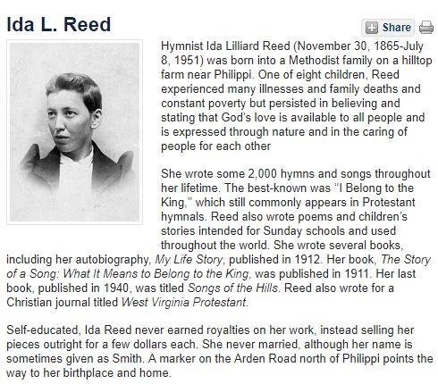 “Reed is said to have written 2,000 hymns in her lifetime. … In 1939, the American Society of Composers, Authors and Publishers recognized her ‘substantial contribution to American music’ by awarding her a small weekly “bonus.”
